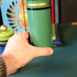 You now introduce two decorative pagoda like covers and some stacked and loose checkers.  Both covers are lifted and shown to be empty. The checkers are used for gambling and a special deck of cards is introduced and a card is chosen, remembered and returned to the deck.  The checkers are stacked into one pile and covered with one of the covers.  The performer states that as much as he wants to go gambling he is not a member and could never get past the guard, and he’s tried many times 🙁