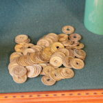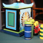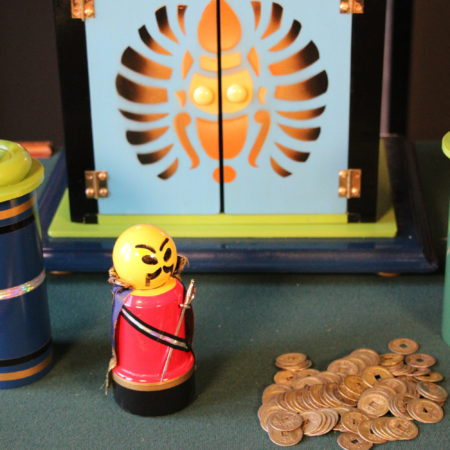 The doors to the Casino are now closed concealing the guard and his fortune.  The performer then notices some loose Chinese coins on the top of the Cabinet and with a smile quickly pockets them and says: “Boy it is my lucky day, lets try something else!”  He says “Watch closely, it all happens very quickly.”  With a snap of his fingers he lifts the pagoda covering the checkers and it has turned into a huge pile of gold coins.  The performer says “Remember the guard never strays from his fortune and lifts the other previously empty Pagoda and there is the Guard, stern as ever looking after his Gold.
