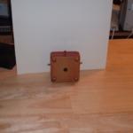 A wooden box (5 inches square) with a black spot in the center of the lid is opened and shown empty. This empty box is now suspended from the golden cords so it is hanging in the center of the silk-covered board.