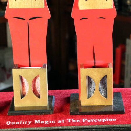 The two shuffled decks are cleanly dropped into the lower houlettes and the magician explains he is going to take a card from each houlette and drop it in the top for each bellhop one at a time. The spectator is free to shout out “Stop Jack!” and “Stop Harry!” whenever they want. There is no force. The spectator shouts “Stop Jack!” first and the card in the performer’s hand is removed. But continues to move cards for Harry until the spectator also shouts “Stop Harry!”.