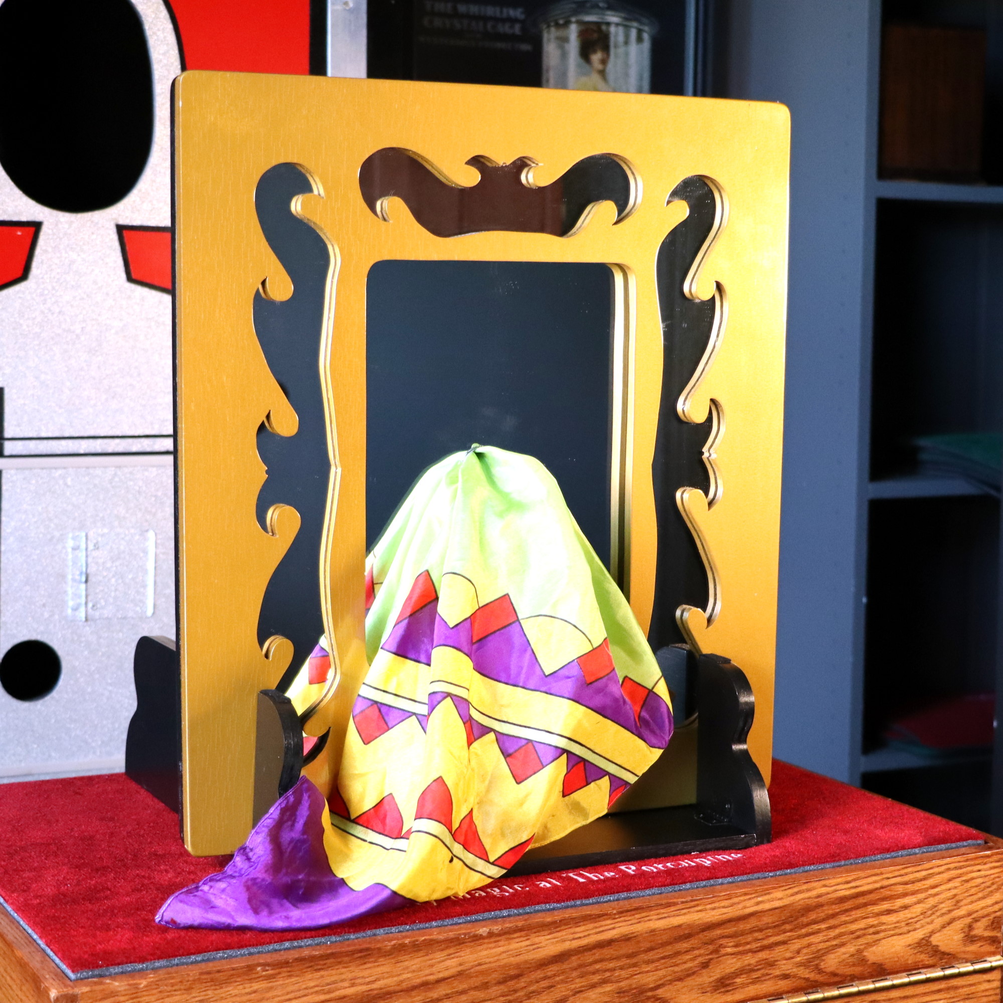 Effect: The effect is startling. Show a beautifully decorated mirror in a stand. The mirror is large, 16″ x 18″. Take the mirror out of the stand and show it all around. Front and back. Nothing to see. Put the mirror back in the stand and the magic begins.