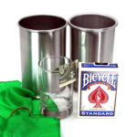 Effect: A spectator’s bill, which he signs or marks, is placed inside a 9″ silk with a rubber band. The silk, rubber band and bill are then placed inside a glass. The glass is covered with an aluminum tube. Before you can blink, the bill has jumped from one tube to the other. But even more amazing, the opening of the second glass is now covered with the 9″ silk which is held on by the rubber band and the bill is inside the glass under the silk. And, yes, the spectator removes the band and the silk to discover that it is, indeed, his SIGNED Bill.