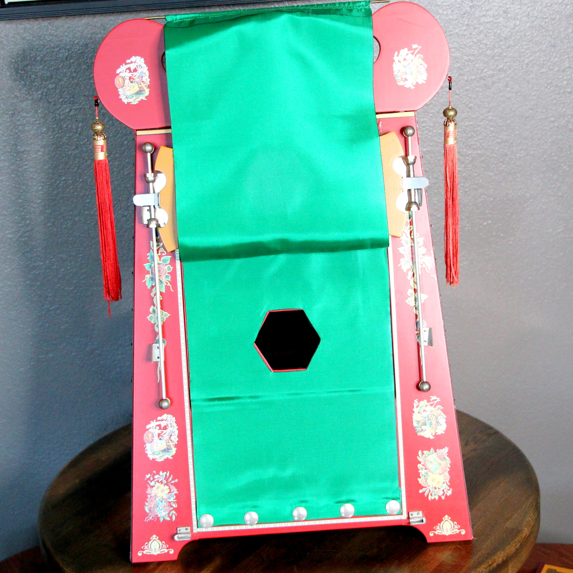 A bar is lowered and raised up and down the frame to reveal an ornate silk cloth underneath. At the magician’s will, solid objects can be passed directly through the Star Trap and pulled out the backside of the frame without tearing the solid silk cloth.