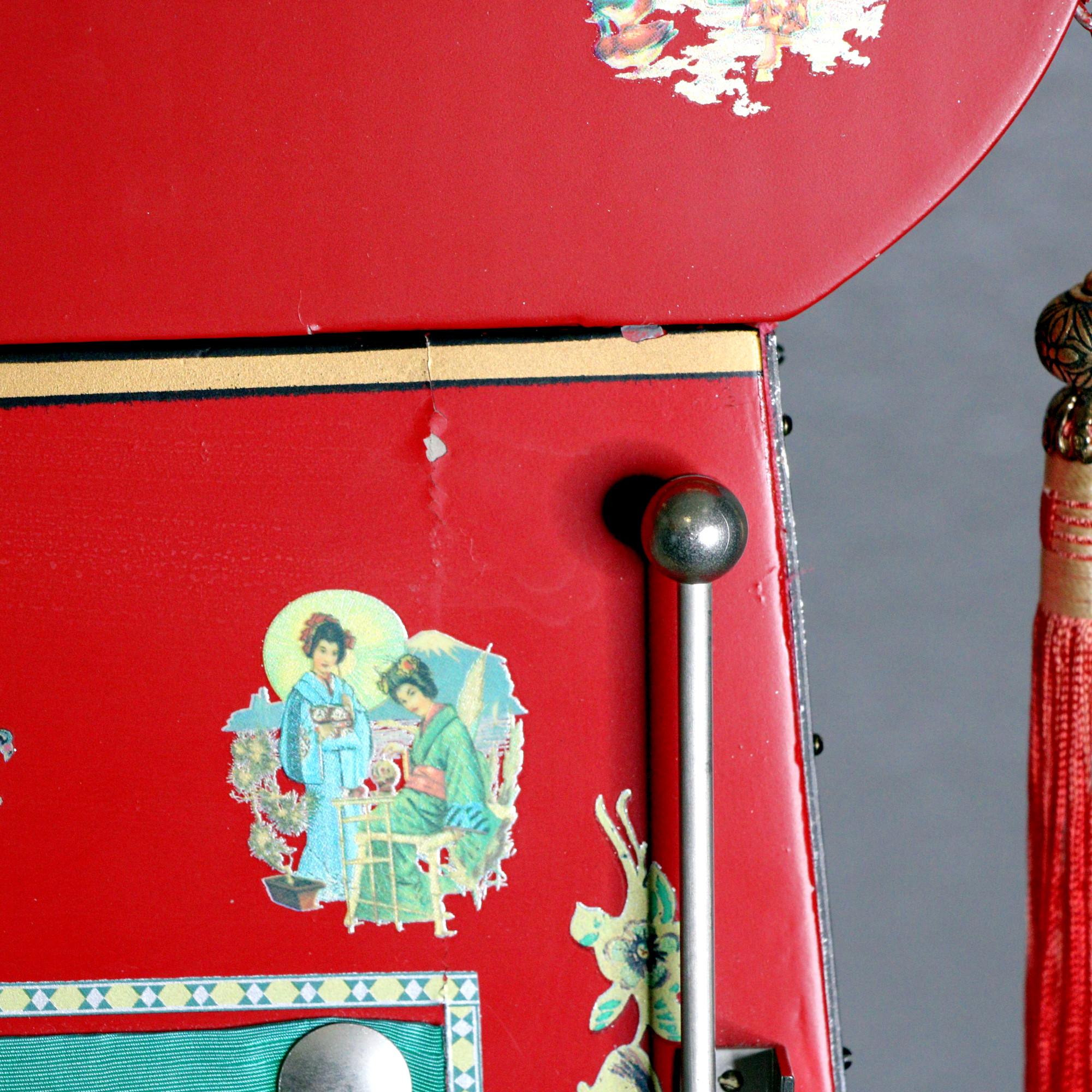 The transfers which adorn this piece are replicas originals used by Okito although the images are not exactly those selected by Okito. The reason for the latter is that none of the images available on the original apparatus were suitable for photographs reproduction. The images used were, however, photographed from several Okito pieces other this Matter Through Matter and are, therefore, authentic to that extent.
