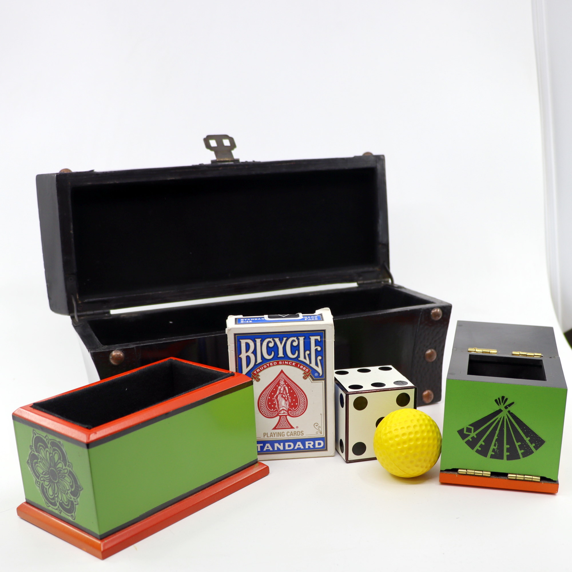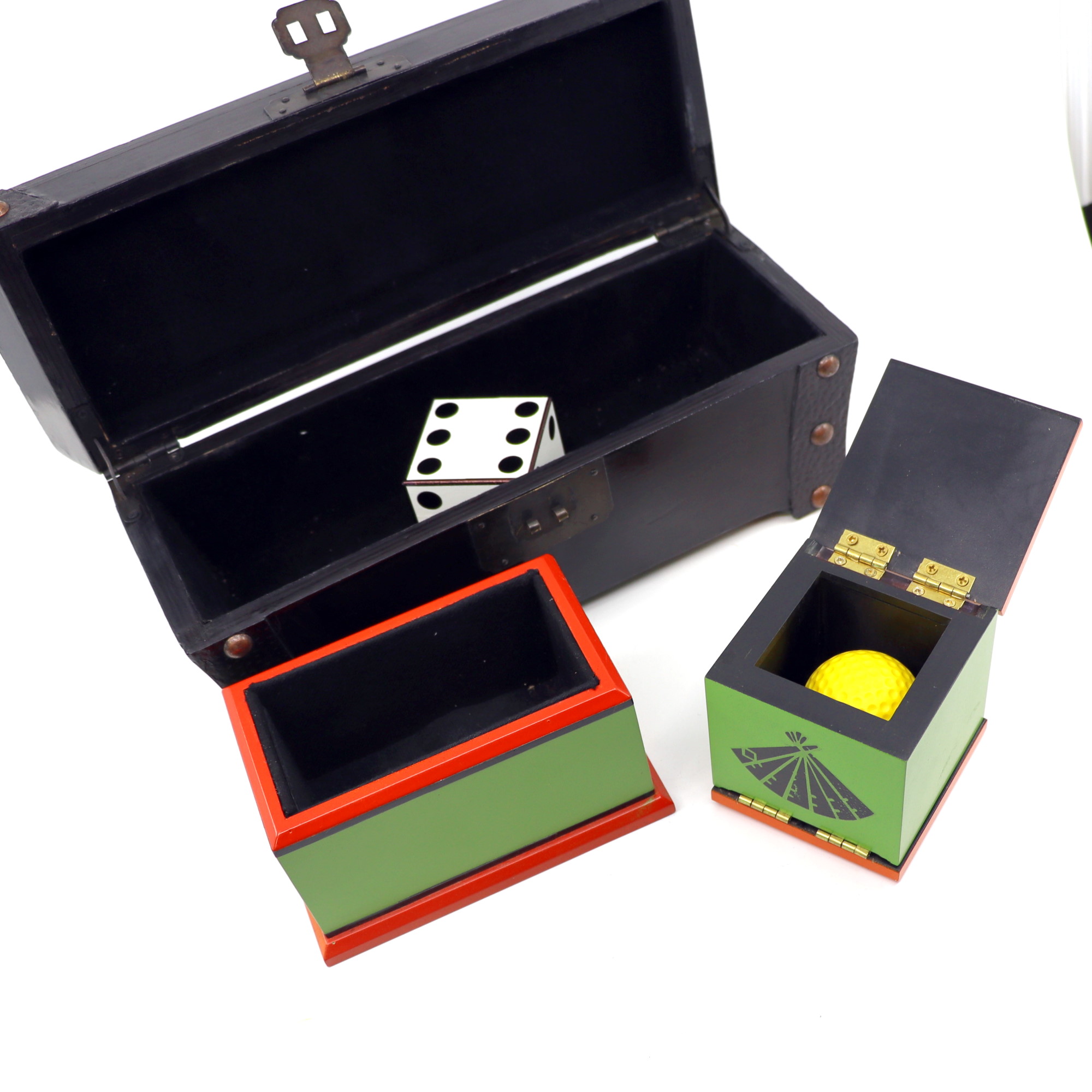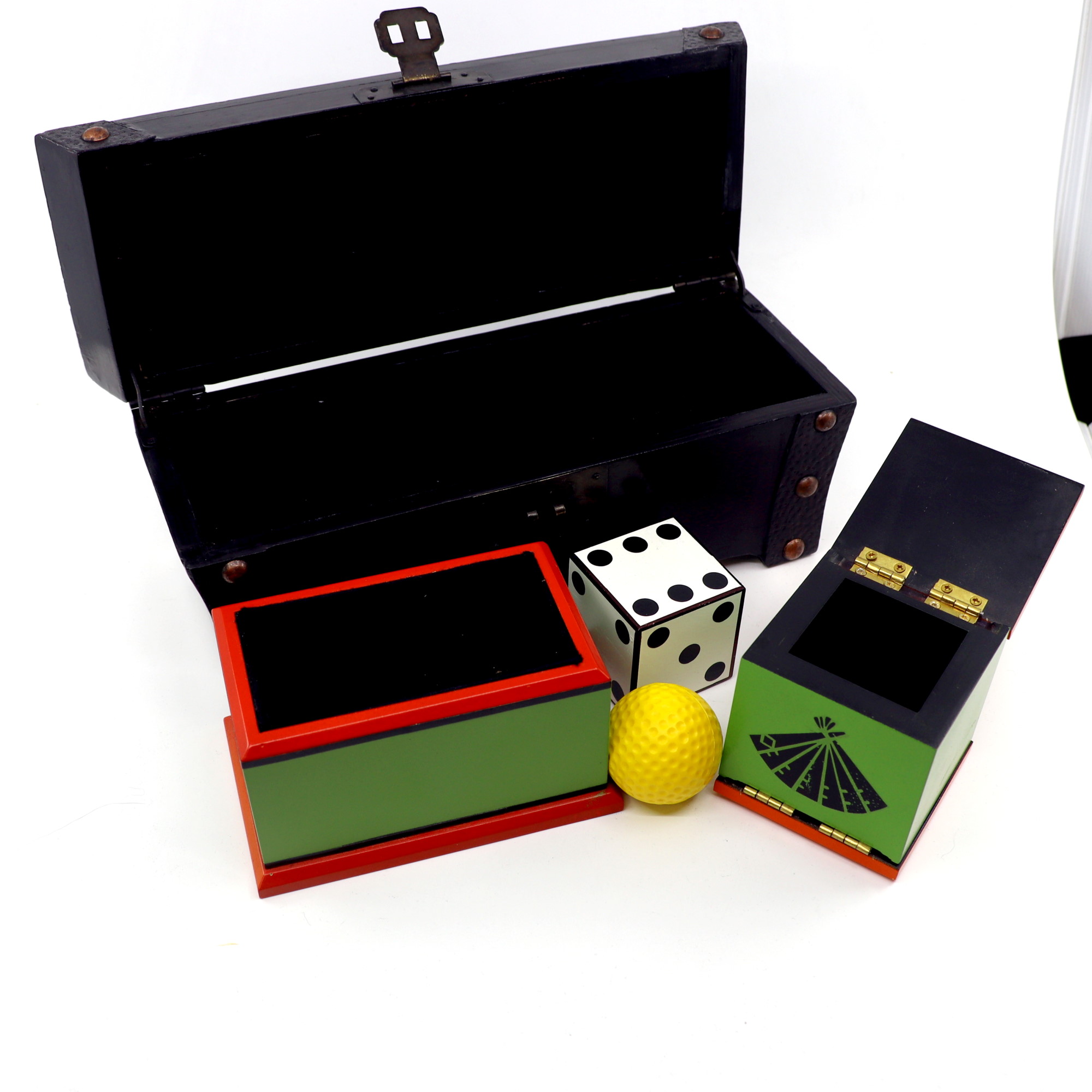 Effect: A die placed in a small box invisibly travels to an empty hat. It momentarily appears in an open-topped larger box before finally arriving in the hat. At the conclusion, when the small box is opened to show that the die is gone, a ball is found in its place.
