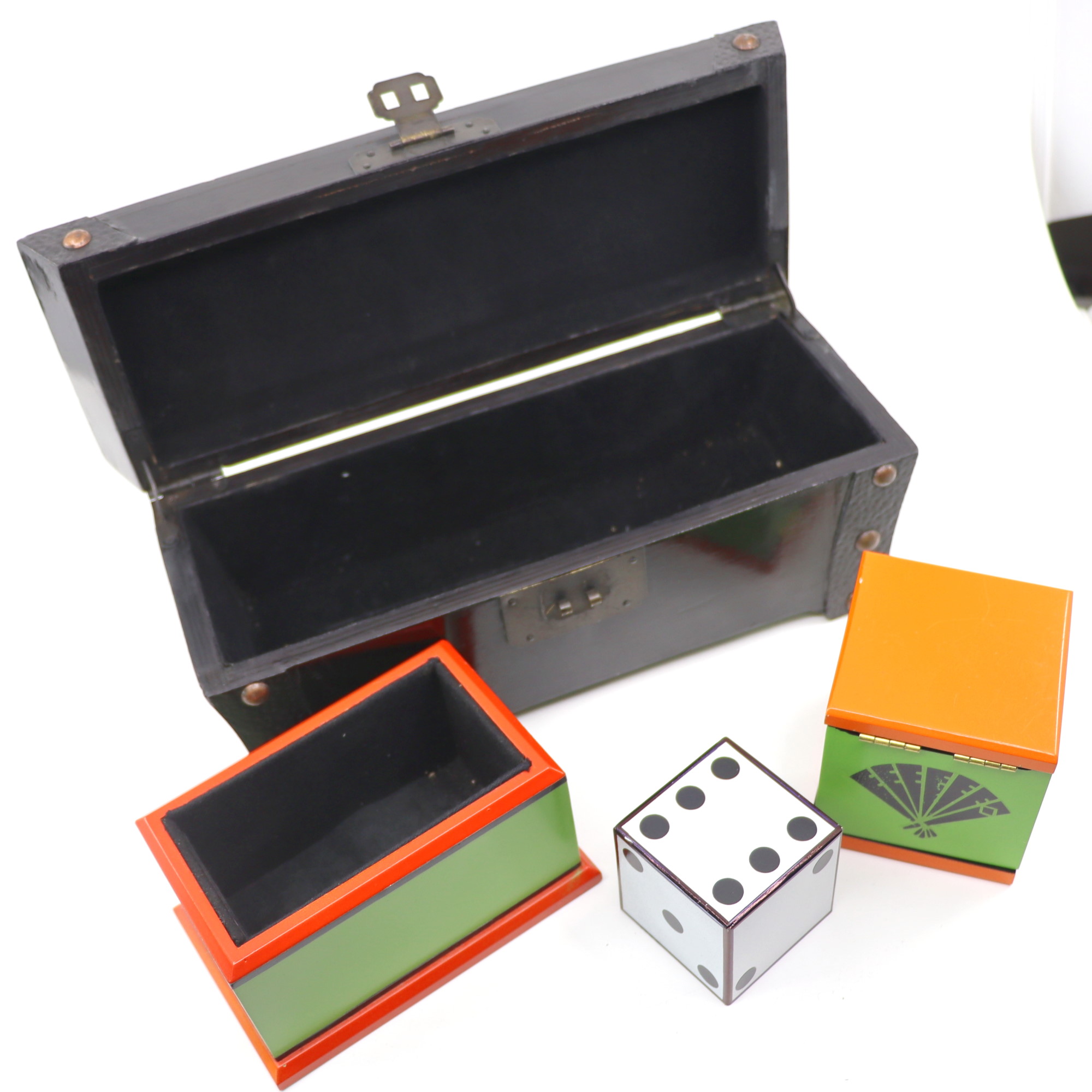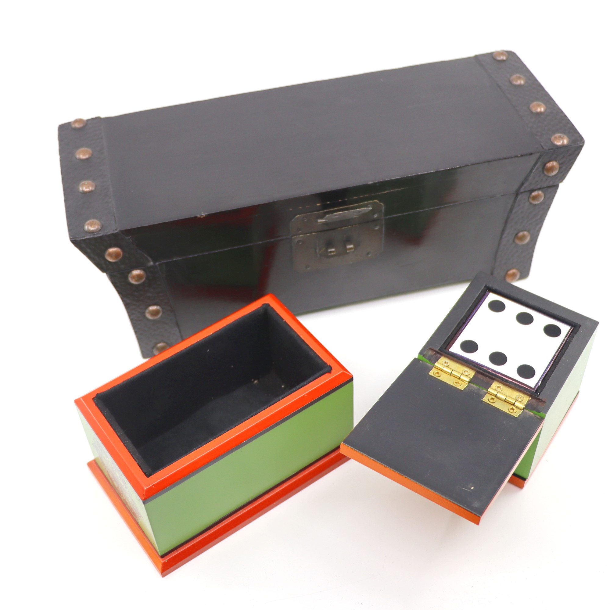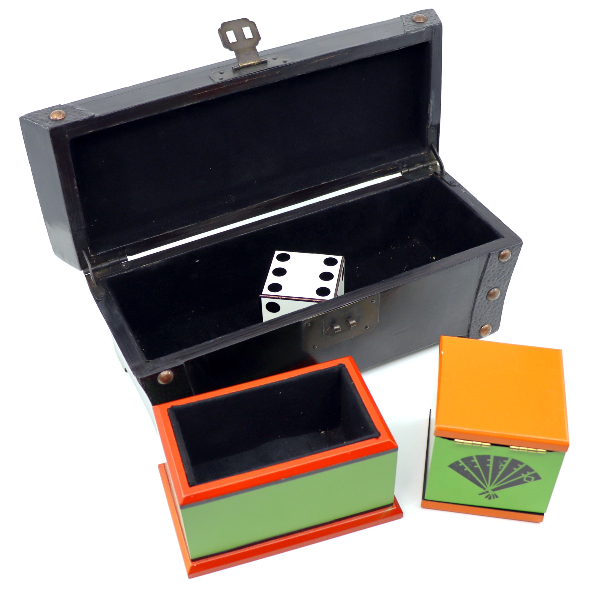 Effect: A die placed in a small box invisibly travels to an empty hat. It momentarily appears in an open-topped larger box before finally arriving in the hat. At the conclusion, when the small box is opened to show that the die is gone, a ball is found in its place.