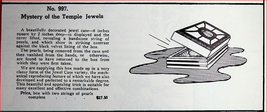 The pearls, being removed from the case and then vanished from the hands, or otherwise, are found to have returned to the box from which they were first taken. We are supplying this box made up in a very classy form of the Jewel Case variety, the mechanical reproducing feature of which we have also developed and perfected to a remarkable degree.
