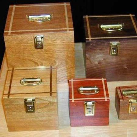 Effect: This is a set of five nested boxes, with each one made of a different wood with contrasting inlay. A watch or marked coin is borrowed from a spectator. It is vanished. The largest box is unlocked and opened. The next box is removed and unlocked. When the last box is remove, it is taken to the spectator. She is given the key and asked to unlock it. She opens it and finds the vanished watch or coin.