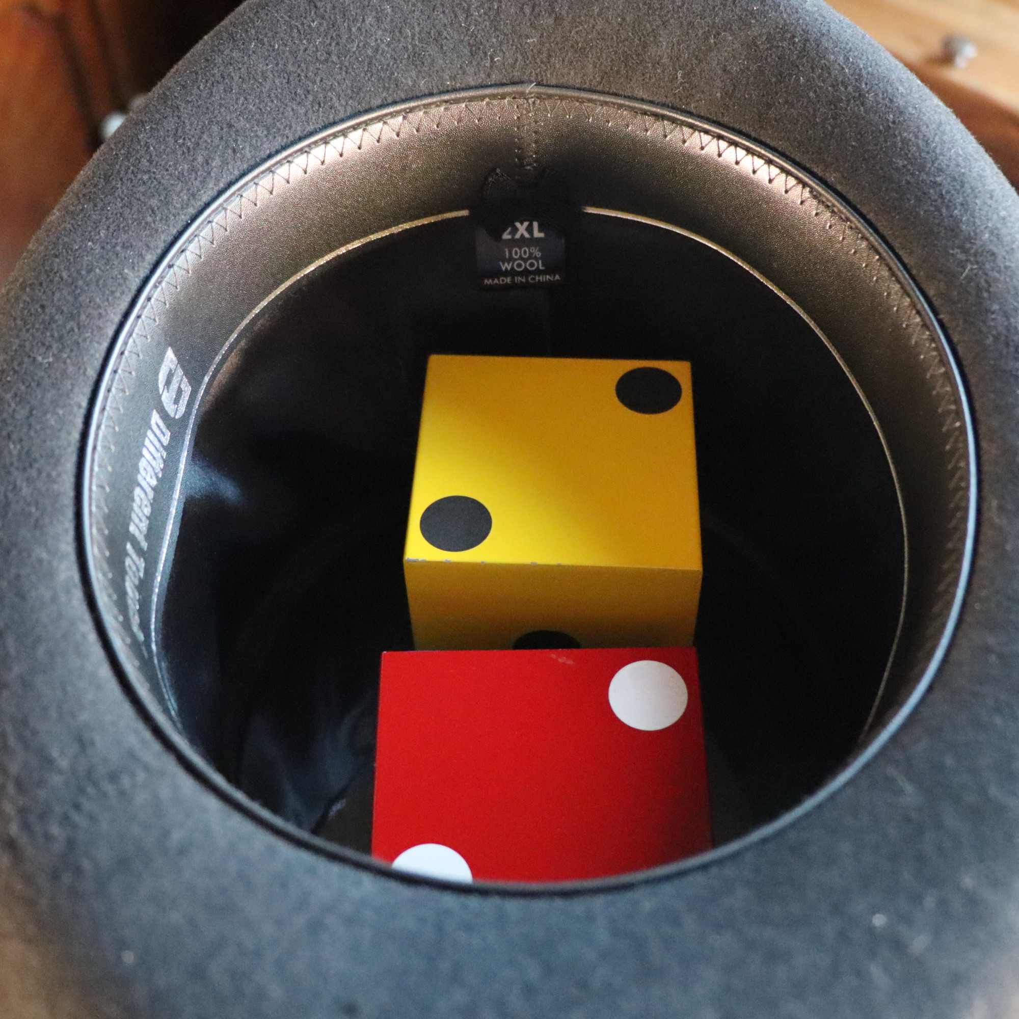 Effect: You begin by showing the red and yellow die and they change places audibly, then visually, and finally they disappear, change color and return back to the top hat!
