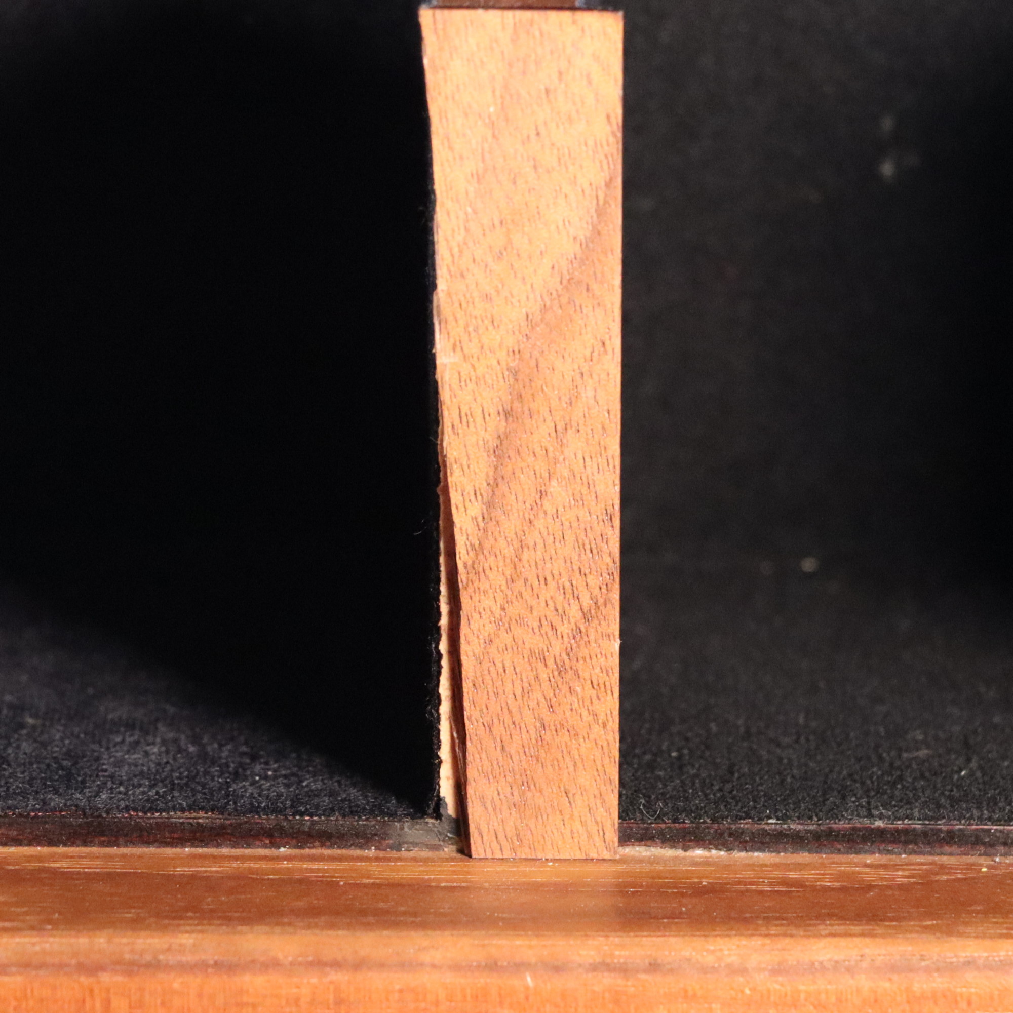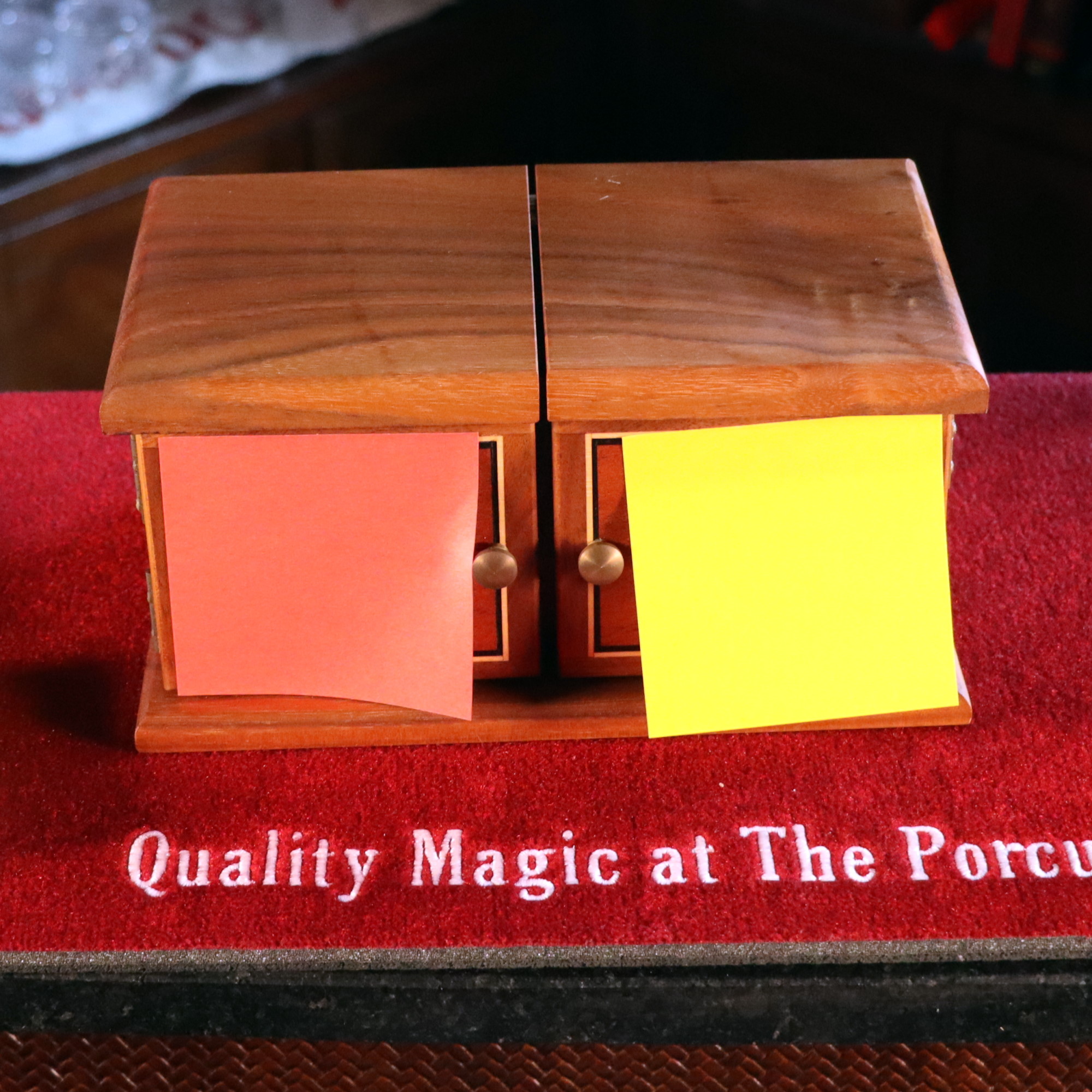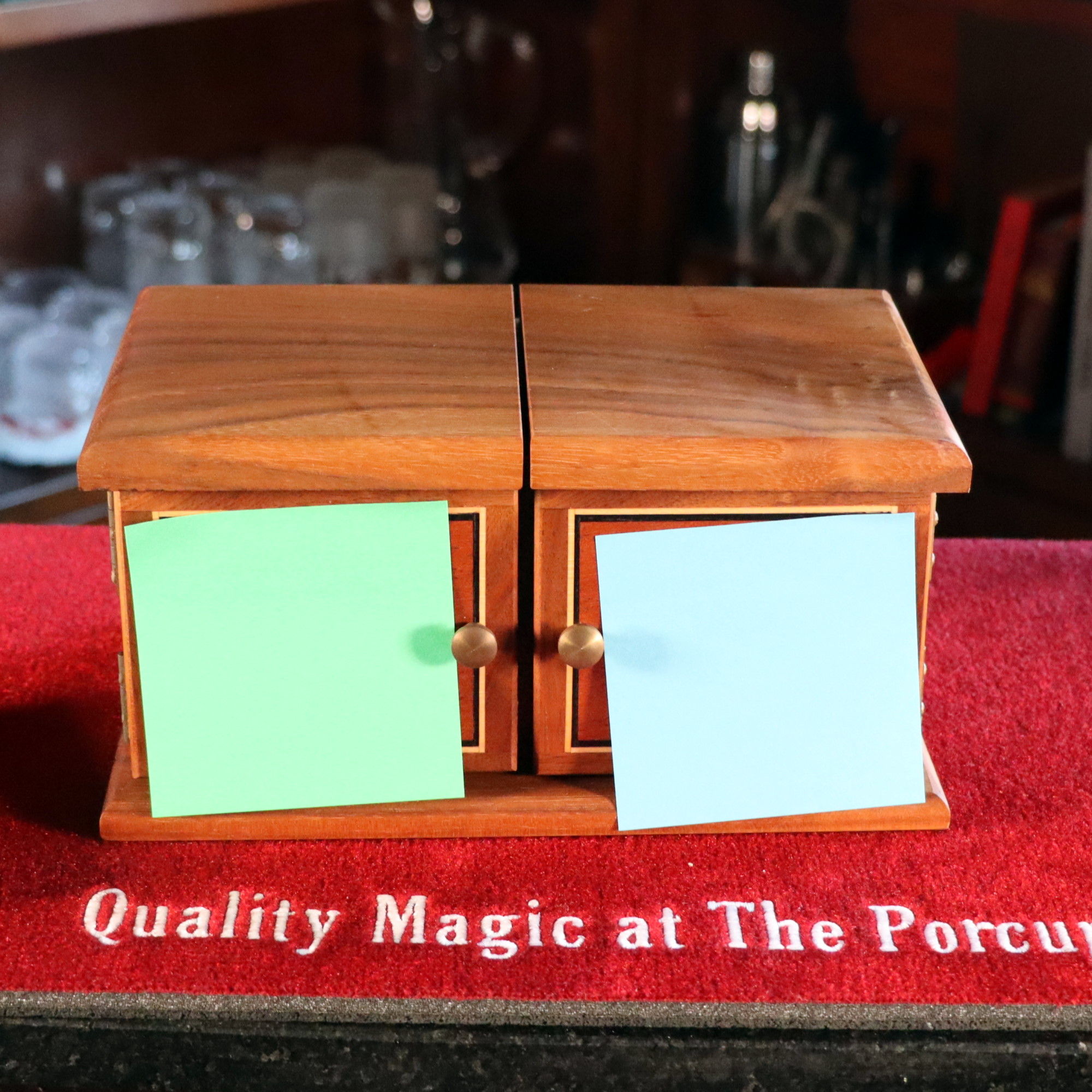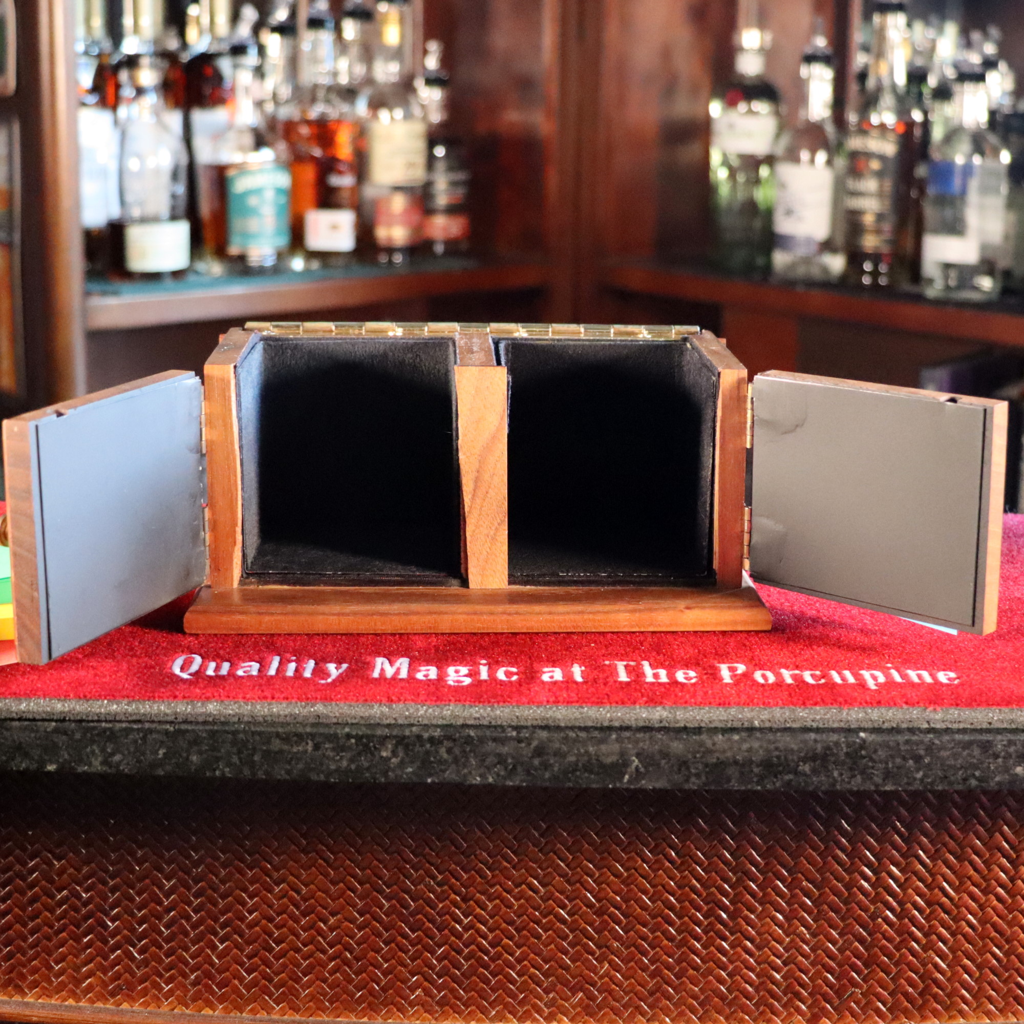 Mel’s rainbow version of the Die Box, is based on an old Thayer design as referenced in Dr Albo Book II as a Thayer Rainbow or Multicolor Die Box. This style of Rainbow Die box was popularized by Richard Himber’s Rainbow Die Box c. 1955 including an entry in Bart Whaley’s Who’s Who in Magic and many ads in Genii, Hugard’s Magic Monthly.