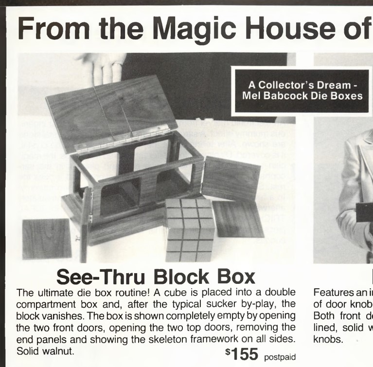 Effect: The ultimate die box routine! A cube is placed into a double compartment box and, after the typical sucker by-play, the block vanishes. The box is shown completely empty by opening the two front doors, opening the two top doors, removing the end panels and showing the skeleton framework on all sides.