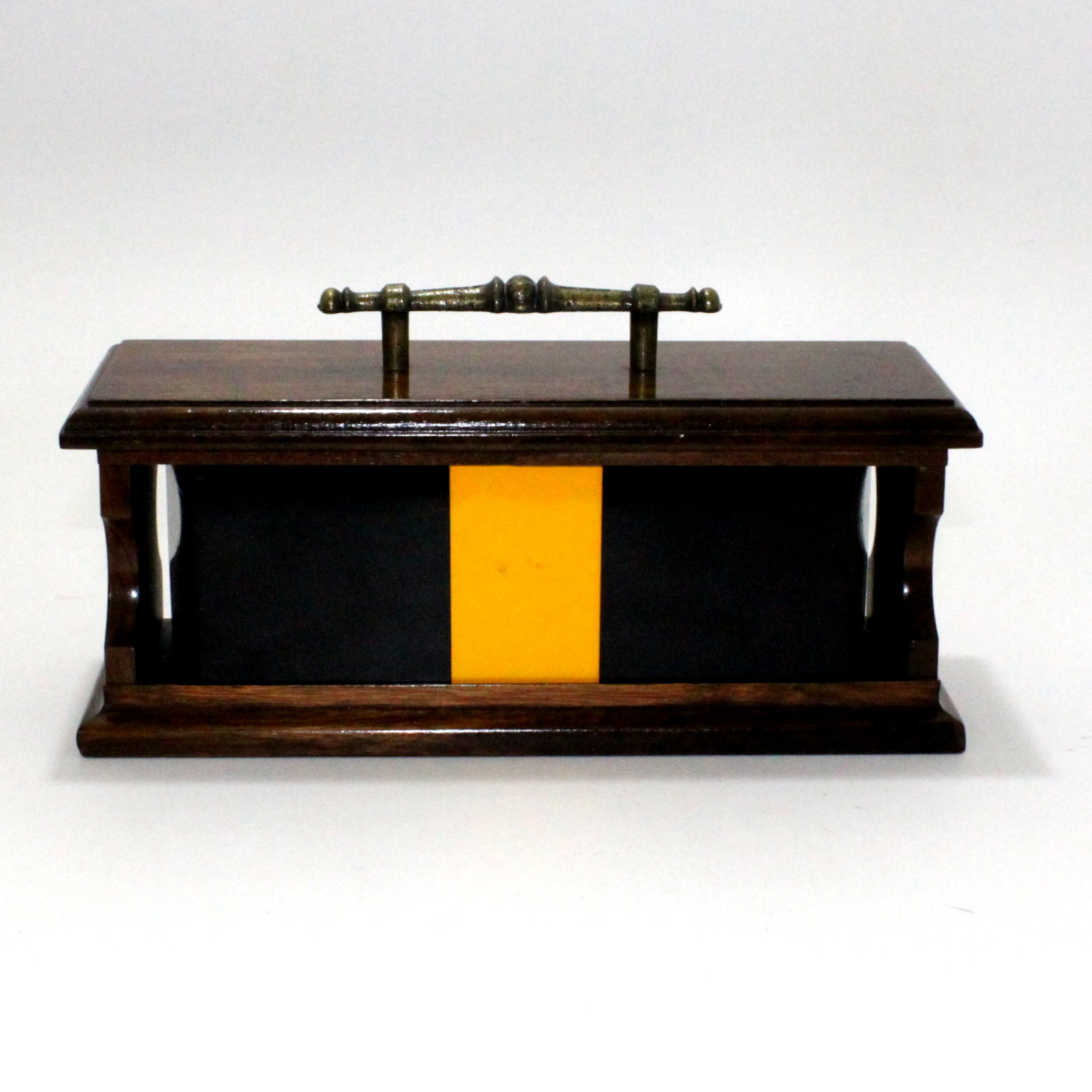 Effect: Magician shows a neat case in which are three blocks — two black and one yellow. The blocks are removed and may be thoroughly examined. The case has neither front nor back. The blocks are replaced with the yellow block between the two black ones. Now the performer slowly and deliberately pushes the two black blocks together. The yellow becomes smaller and smaller until finally the black blocks are touching each other and the yellow block has vanished completely. The case is swung around — the audience sees only the two black blocks. The blocks are taken out of case and tossed out for examination — and the yellow block is discovered under a borrowed hat.