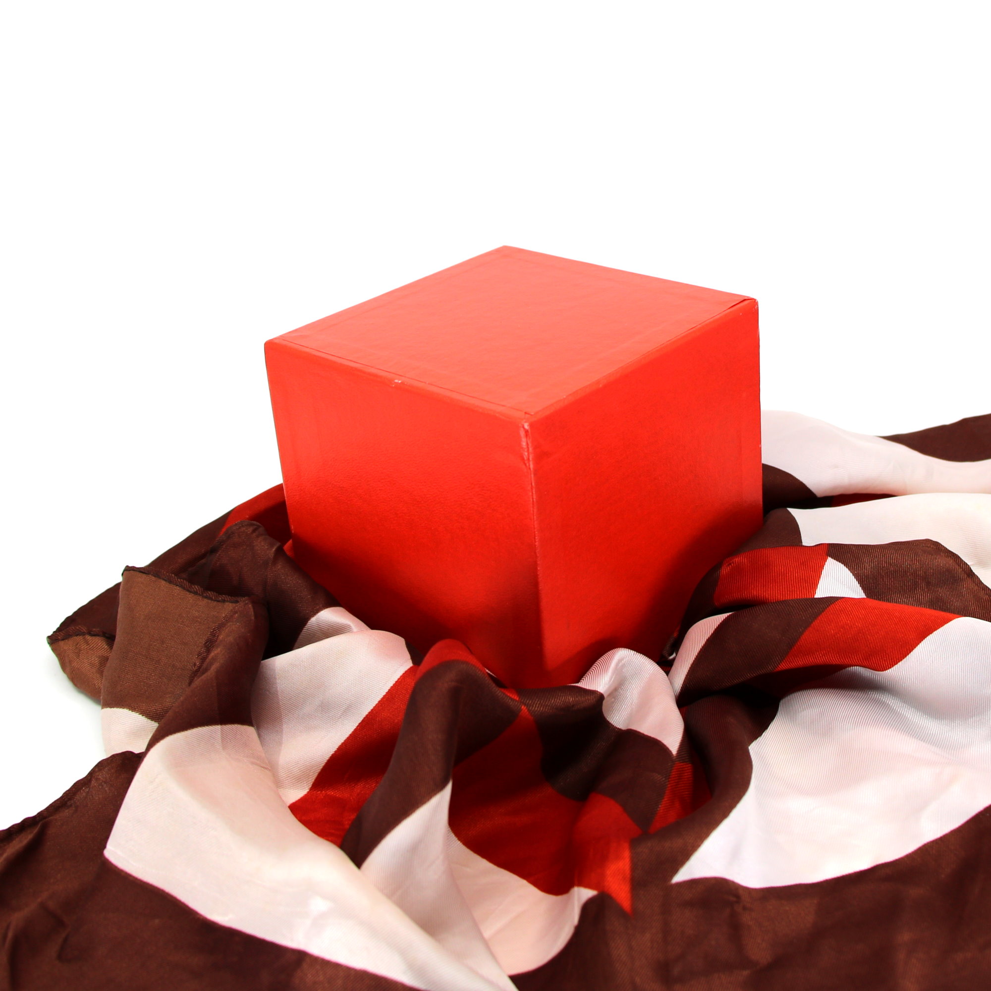 Amongst the magicians who requested a larger size, suitable for stage presentation, was Jeffery Atkins, who purchased one of the originals. Now here it is …. Resting on a 36 inch silk is a die some 4″ inches square, the die is black with white spots. A red cover is shown empty and dropped over the die.