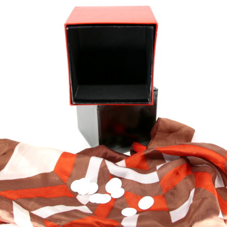 Magician holds the covered die in his hand. Magically and mysteriously, the die begins to penetrate through the silk. Help!!!!! It’s now a plain black cube! Passing through the silk, all the spots have been left behind. The die is freely shown. The silk is removed from the cover; from the cover is tossed out all the missing spots!!!!