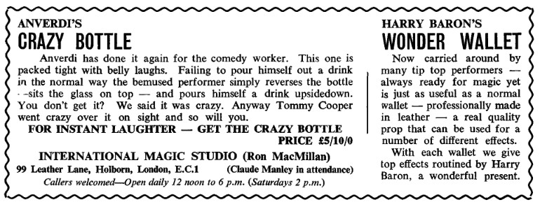 (c. 1964) (Submit Review) (Submit Update)Another of the many Perspex bottles made by Anverdi that first appeared in his book Anverdi’s Miracles With Liquids. Anverdi describes two Crazy Bottles: The Crazy Bottle and The New Crazy Bottle – the two variations on this page don’t quite adhere to either definition.