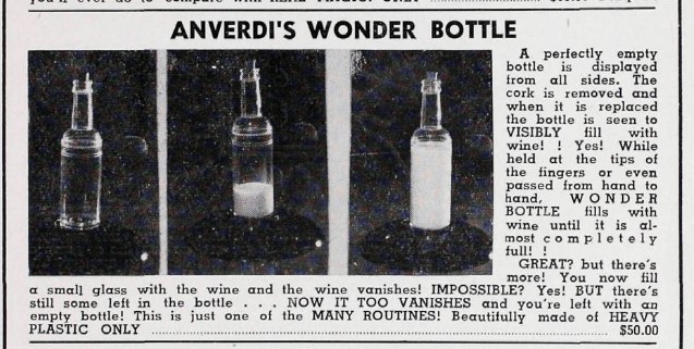 (c. 1963,1968) (Submit Review) (Submit Update)Here is another of the many Perspex bottles made by Anverdi that first appeared in his book Anverdi’s Miracles With Liquids. There are two bottles that Anverdi created that are almost exactly the same bottle – the Wonder Bottle and the Universal Bottle. The only difference is that in the Universal Bottle two small disks are glued to the bottom and top of the neck vs. being loose with the Wonder Bottle. Some of the effects described can be done with either bottle.