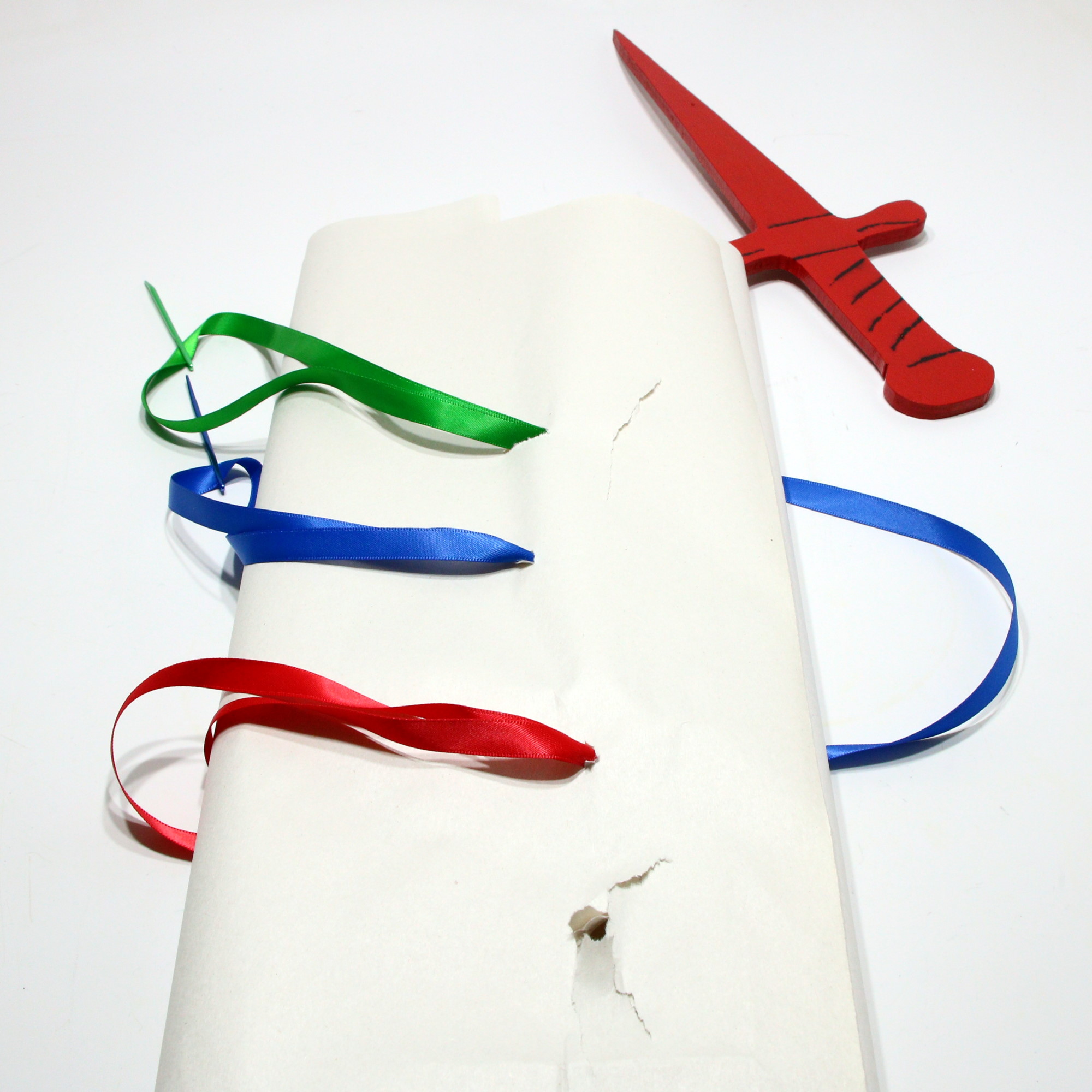Effect: A model glass window is freely shown and the glass proven to be real glass. It is then wrapped in newspaper. While all eyes are focused on the performer, he plunges a RED DAGGER right through the CENTER OF GLASS. Three fancy, colorful ribbons are then pushed through the glass from many angles, the effect being that you are SEWING THROUGH GLASS. The ribbons are clearly seen to be hanging down on both sides and are pulled back and forth. This effect of SEWING THOUGH GLASS is one of the very prettiest effects to watch in magic.