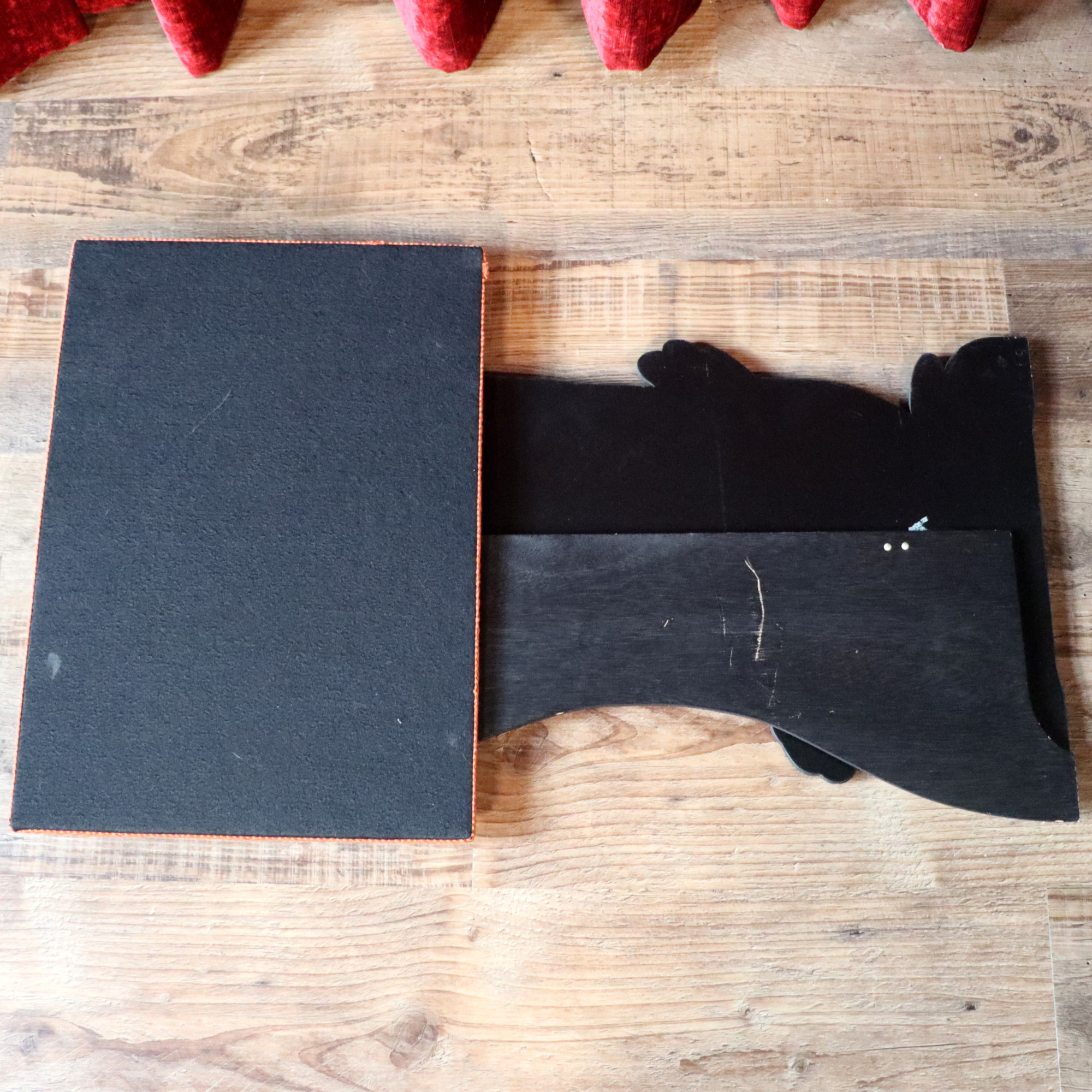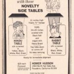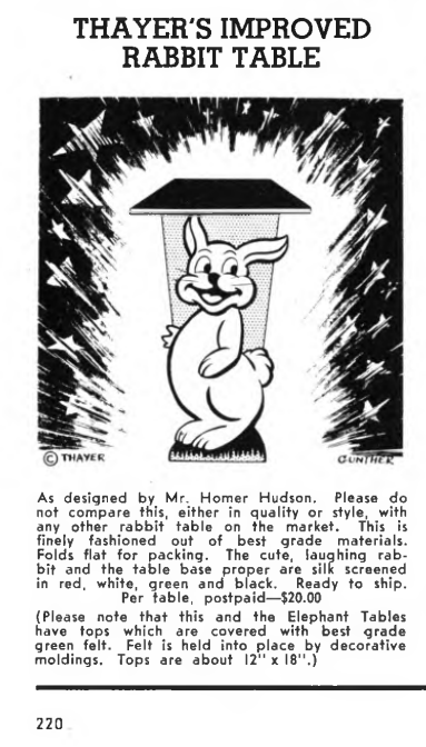 Effect: As designed by Mr. Homer Hudson. Please do not compare this, either in quality or style, with any other rabbit table on the market. This is finely fashioned out of best grade materials. Folds flat for packing. The cute, laughing rabbit and the table base proper are silk screened in red, white, green and black.