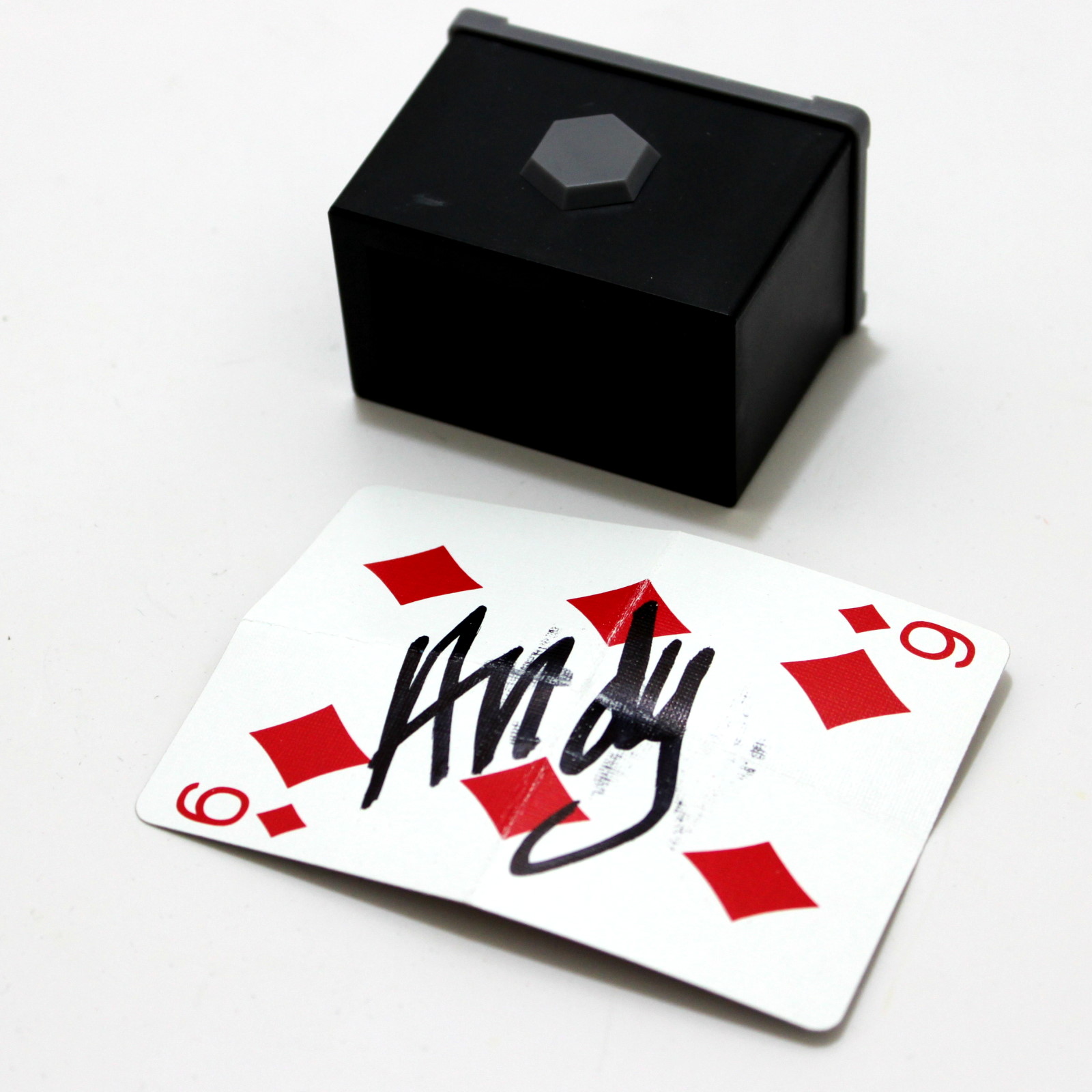 Effect: Magician brings out a small wooden box and places it on the table. A playing card is freely chosen and signed by a spectator. Card is shuffled back into the deck. Magician asks: “Do you think that I can find your card in less than 10 seconds without even looking at the cards?” He holds the deck behind his back for several seconds, brings it back out, announces “I’ve found it!.” He points to the wooden box. But, no way! No one has been any where near the box! Magician asks the spectator to lift the lid of the box and see what is in there. It is a folded card.